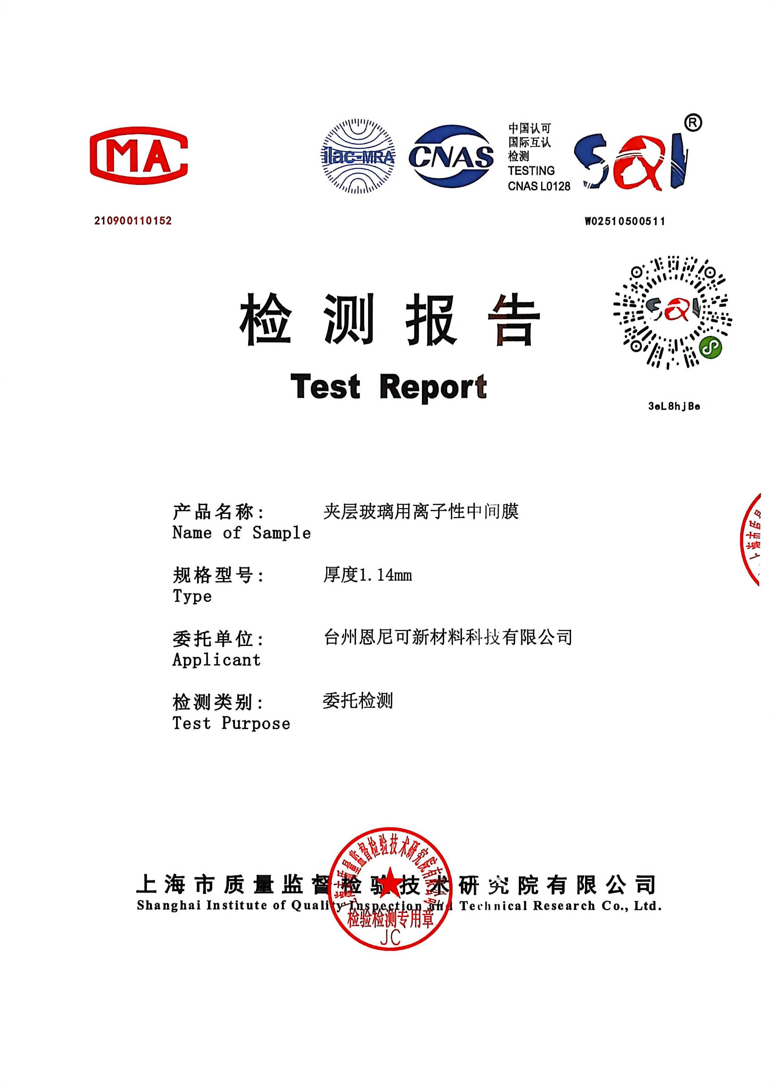 公司引进法国进口专业检测设备,建立从原料入厂、生产过程到成品出库的全流程质量控制体系。 对SGP离子性中间膜进行力学性能、光学性能、耐候性能、尺寸稳定性等全方位苛刻检测, 确保产品符合中国国家行业质量标准及行业体系认证。