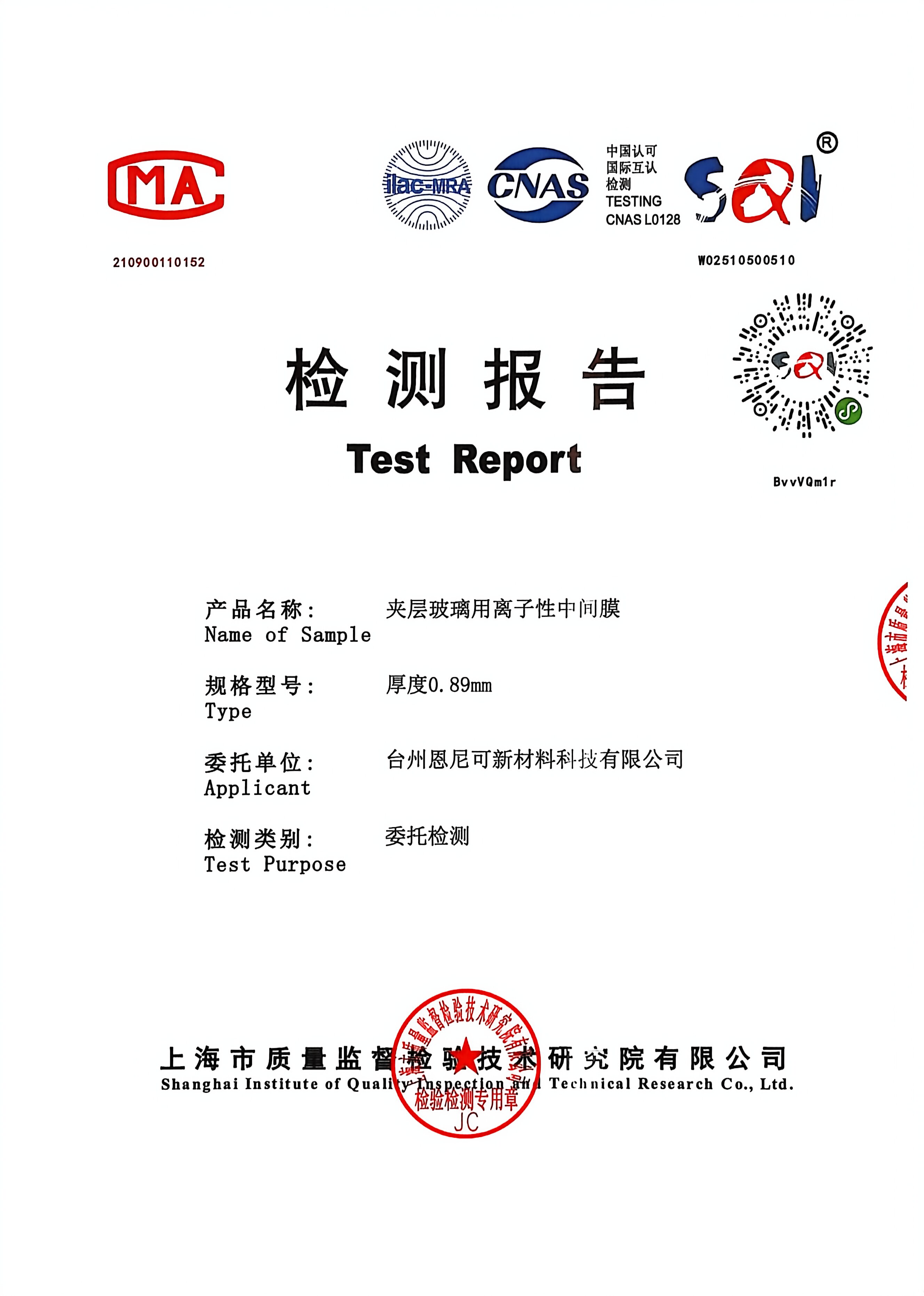 公司引进法国进口专业检测设备,建立从原料入厂、生产过程到成品出库的全流程质量控制体系。 对SGP离子性中间膜进行力学性能、光学性能、耐候性能、尺寸稳定性等全方位苛刻检测, 确保产品符合中国国家行业质量标准及行业体系认证。